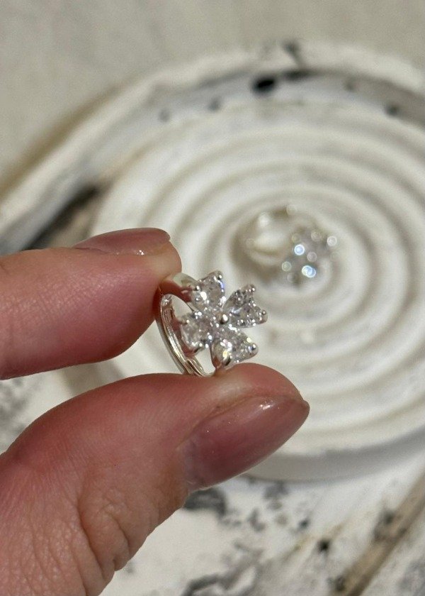 Aros argolla de acero blanco con flor de strass transparentes. Cierre a presión.