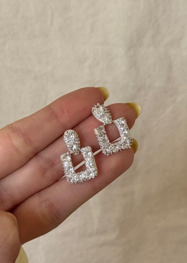 Aros colgantes rectangular cubiertos de strass transparentes. Cierre mariposa