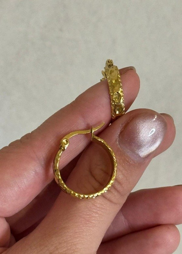 Aros argolla de acero dorado texturado. Presenta cierre articulado. Acabado brillante que resalta la textura.